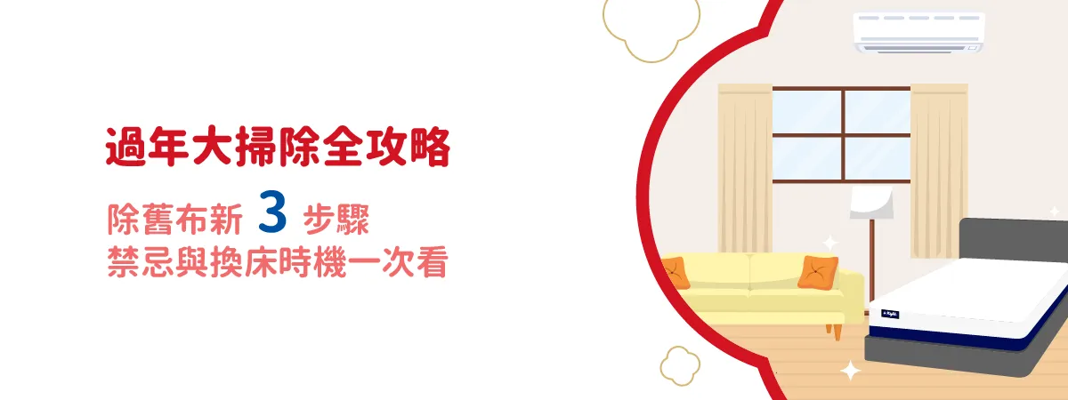 別擔心!本文特別整理了高效率大掃除攻略,從清潔順序、斷捨離心法到床墊保養步驟,幫助大家解惑過年換床的最佳時機與 5 大習俗禁忌,讓你輕鬆搞定年終掃除,用最舒適的狀態好眠迎新春!